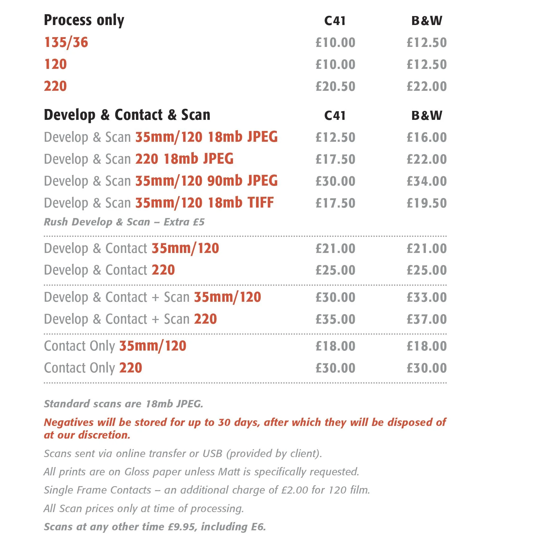 We process your black and white films by hand, giving us a high degree of control and flexibility. This means that you receive beautiful prints which produce as much detail and tone from your negative as possible, time after time. We are always happy to discuss any bespoke requests, please get in touch for further details.